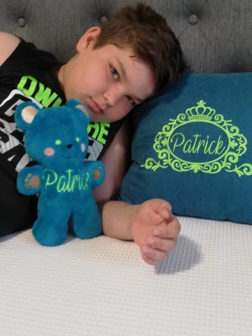 Set pernuță + ursuleț textil personalizate prin broderie cu nume Patrick
