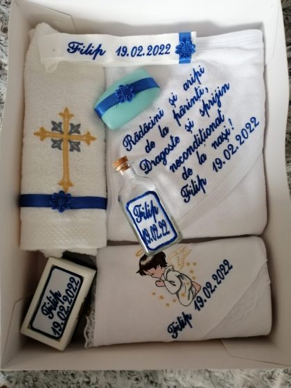 - Prosopul cu capișon: după ce bebelușul a fost șters cu pânza de mir, se înfașă în acest prosop și în el va rămâne până la sfârșitul ritualului de creștinare. Prosopul este personalizat cu numele și data botezului/ data nașterii.